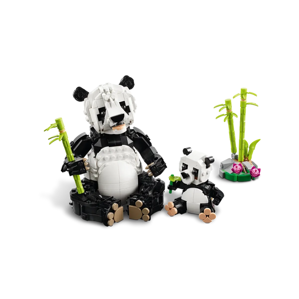 Kids 8+ can choose to build 3 different LEGO® animal playsets with the same set of bricks: a posable panda figure with its cub next to bamboo stalks; a posable orca figure with its calf, who can be displayed together on transparent stands; or a posable penguin toy and its chick on a patch of ice and water.