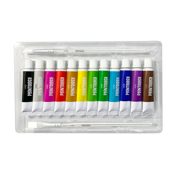 - Kit includes 12 acrylic colored paint tubes, 2 paint brushes (one thin and one broad)